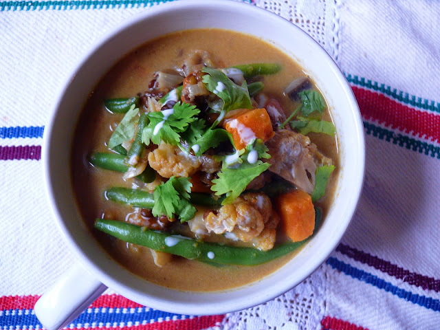 Nagyon egyszerű és tartalmas indiai egytálételt készítettem rengeteg zöldséggel: fekete lencsével, batátával, zöldbabbal, karfiollal. Nagyon sűrű és kiadós étel, kicsit hígabban készítve leves, így főzelék állagú.